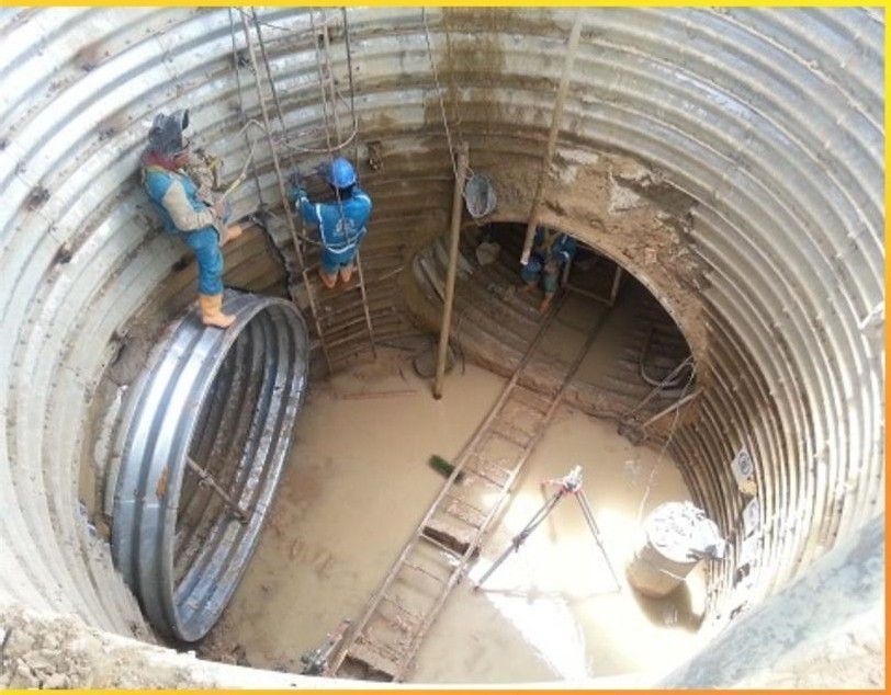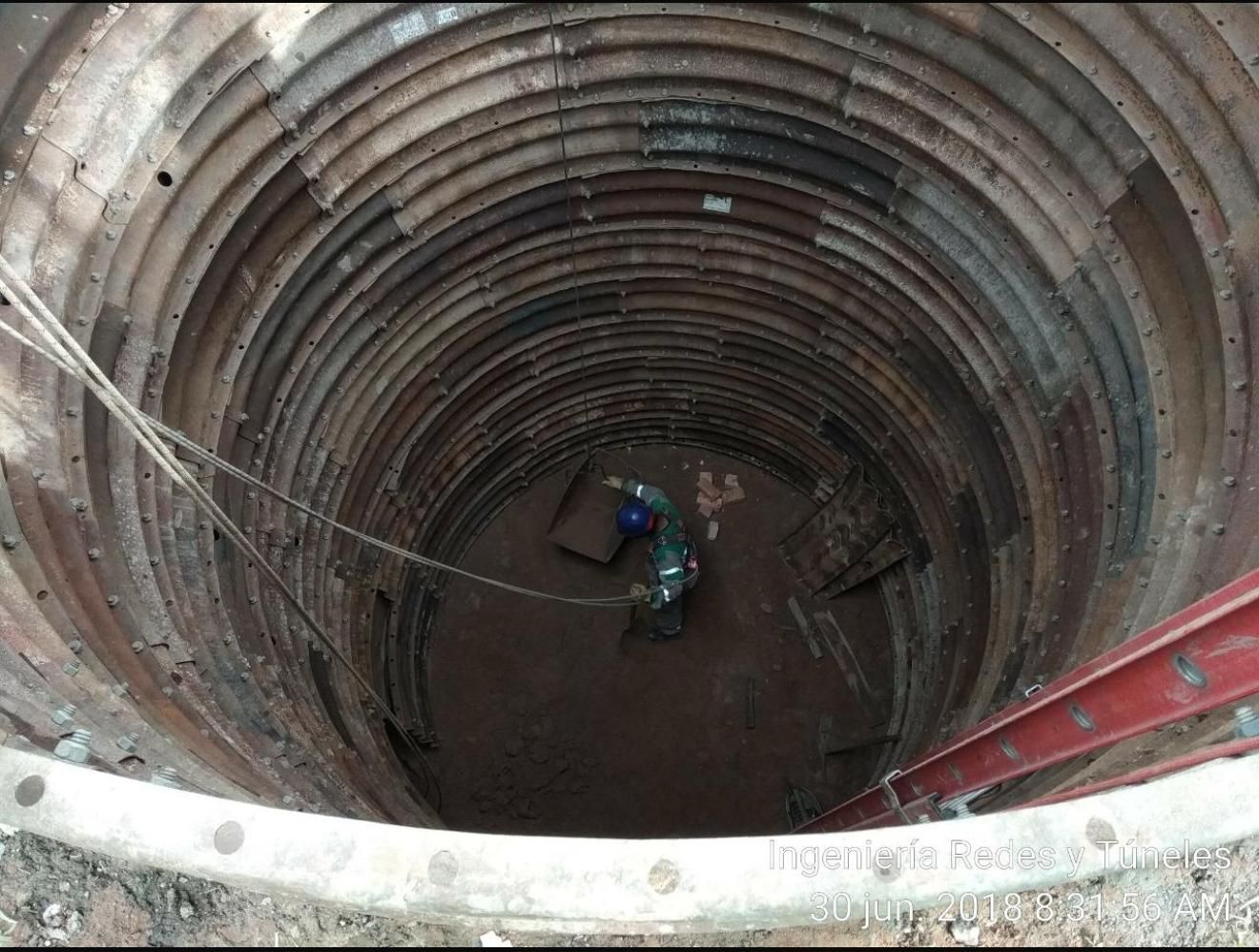 Para la construcción de un túnel utilizando Túnel Liner, se construye un pozo vertical, utilizando láminas de acero corrugado. El pozo alcanza una profundidad hasta de 10 metros en promedio, para no interferir con otros servicios canalizados en forma subterránea.